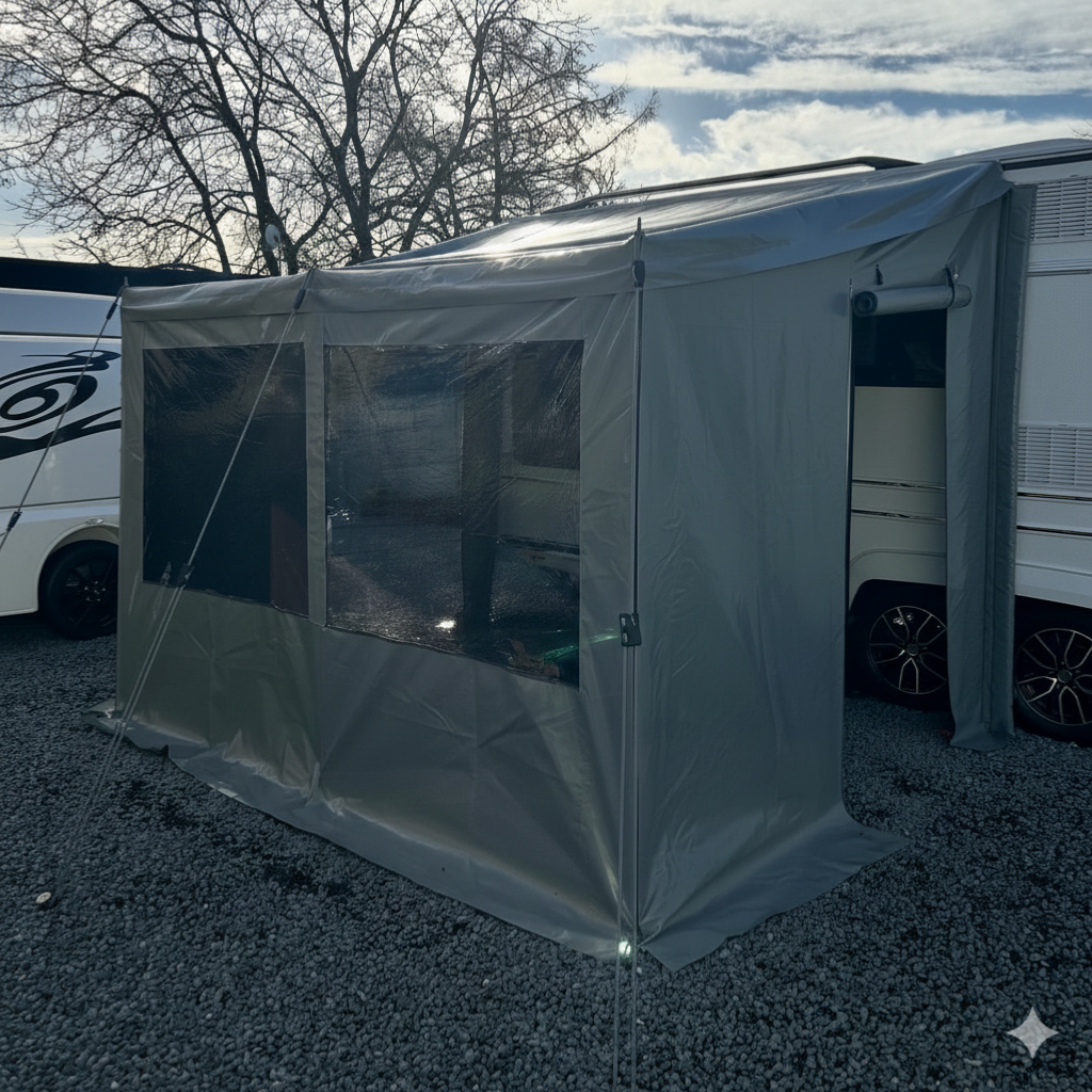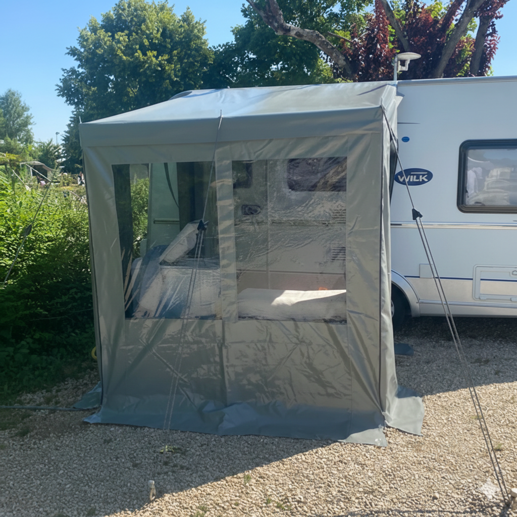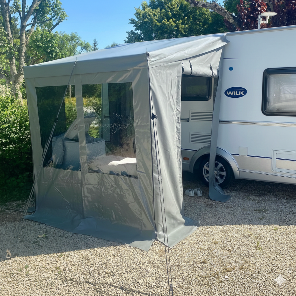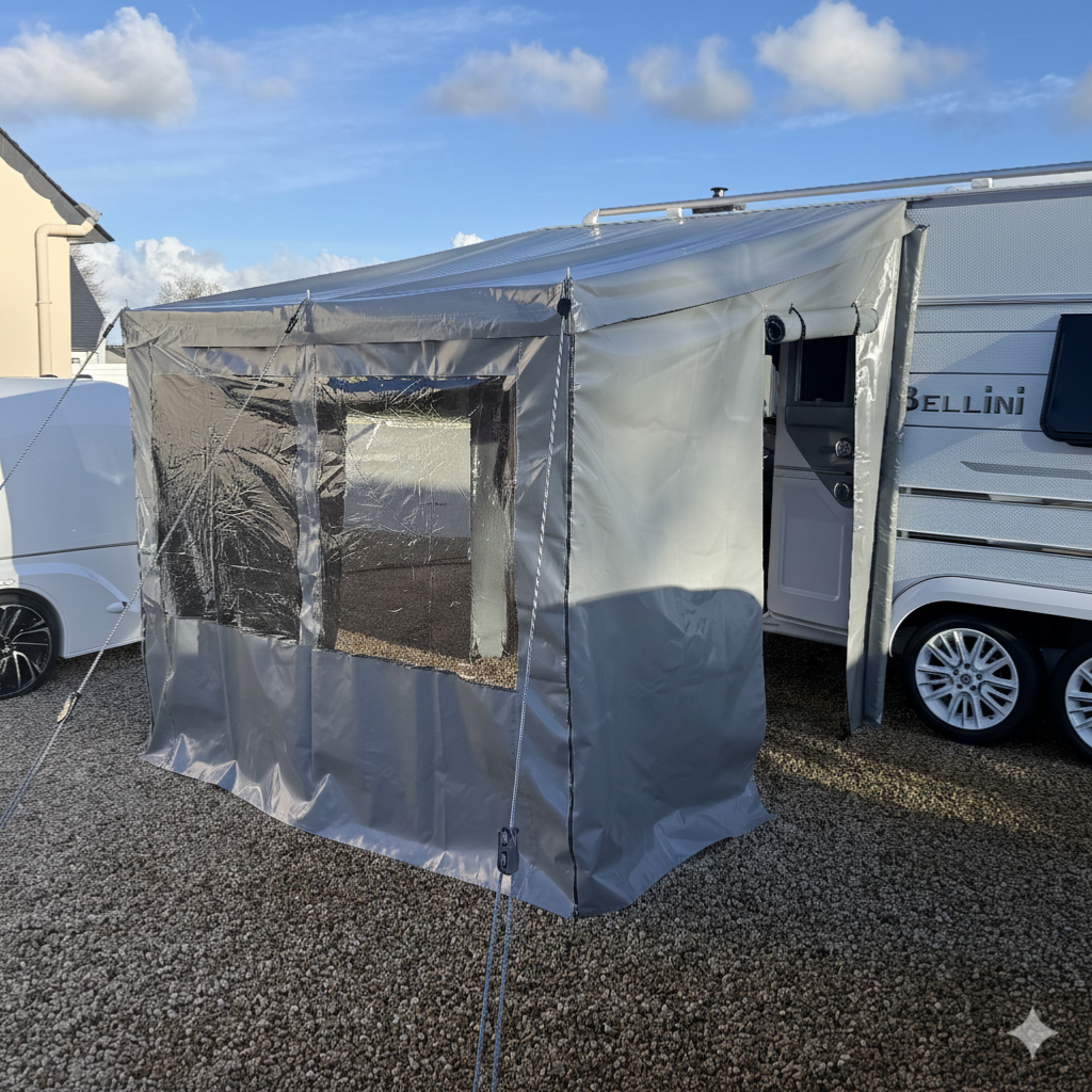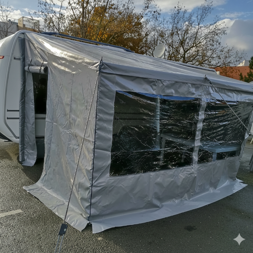 Cet auvent de caravane d'hiver avec carreaux fumés et d’un boudin de protection tout le long de la caravane résiste au froid. Il possède une porte droite de chaque côté.